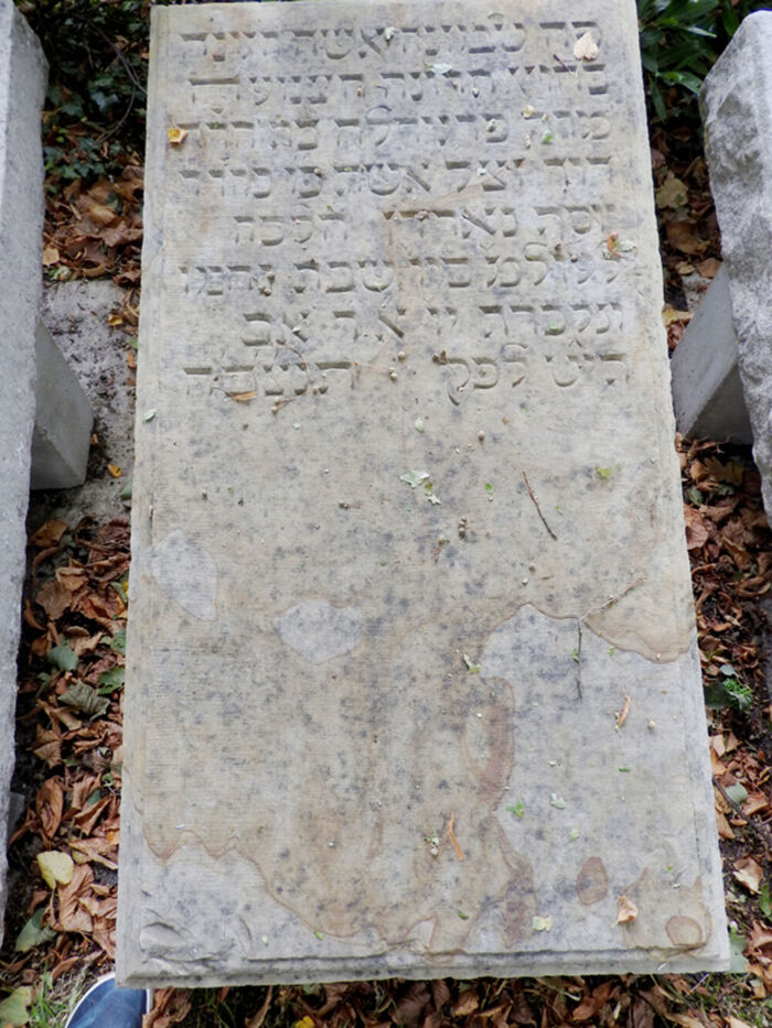 Hier ist verborgen/ eine anständige Frau, von der Welt beklagt/gepriesen, bescheiden/ Friedel, Tochter des Rabbiners Rabbi/David, seligen Andgedenkens, Ehefrau des Gemeindevorstehers und Führers, des geehrten Rabbiners Rabbi/Joseph Norden; sie ging/in ihre ewige Welt am Sabbat der Tröstung/ und wurde beigesetzt am Tage des 21. Ab/ im Jahre 419 (01.08.1659)/ nach der kleinen Zeitrechmumg/ Ihre Seele sei eingebunden in das Bündel des ewigen Lebens.