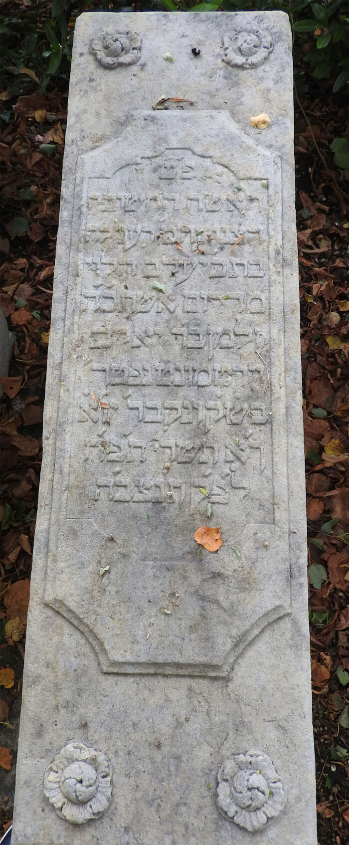 die angesehene, bescheidene Frau, Frau Rachele,/ Tochter des geehrten Ja’akob Halevi/ (vom Süden), Ehefrau des ehrenwerten Herrn/ Salman, Sohn des Rabbi Jakob/ Dortmund; sie starb/ am heiligen Sabbat und wurde am 1. Tag der Woche, dem 21. Tischri begraben/ im Jahre 488 nach der kleinen Zeitrechnung (6.10.1727). / Ihre Seele sein eingebunden in das Bündel des Lebens.