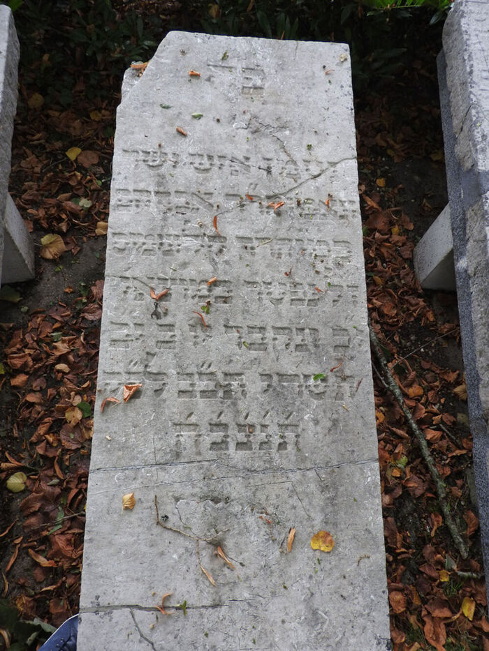 Hier ist begraben/ begraben ist ein Mann, ehrlich/ und treu, der Herr, unser Rabbi Abraham,/ Sohn unseres Lehrers, des Rabbiners Kalonimus/ seligen Angedenkens; er starb am Ausgang/ von Jom Kippur/ und er wurde begraben am 2. Tag der Woche, dem 12 Tischri im Jahre 422 nach der kleinen Zeitrechnung, 5.10.1661. Seine Seele sei eingebunden in das Bündel des Lebens.