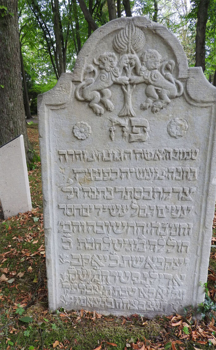 Hier/ Liegt eine anständige Frau, zurückhaltend/ wie Hana, ihre Taten wie Penina./ Wohltätigkeit übte sie in Verborgenheit für/ Arme wie Reiche, Liebe/ und Gnade, die bedeutende und/ gepriesene Frau Gitel, Tochter des ehrenwerten Jakob, Frau des ehrenwerten Ja’akob/ Adil verschied am Sabbatausgang/ und wurde beigesetzt a, 1. Wochentag, am Sonntag, dem 21. Tewet 492/ nach der kleinen Zeitrechnung (12.1.1732)./ Ihre Seele sei eingebunden in das Bündel des Lebens im Paradiese. Amen