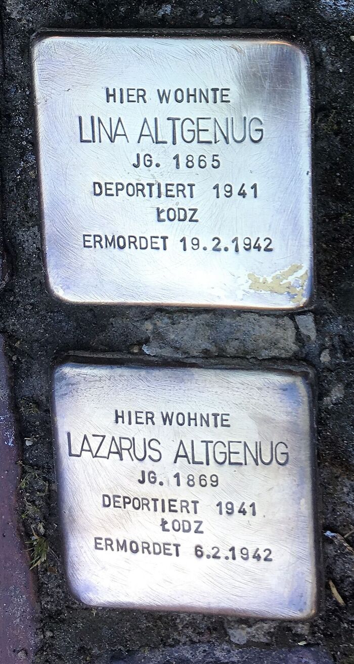 ♂ Altgenug, Wolff, ∗ 08.11.1854 in Norden, ✡ 18.03.1940♂ Altgenug, Moses Levy, ∗ 03.02.1857 in Norden, ✡ 07.06.1938♂ Altgenug, David Levy, ∗ 26.08.1858 in Norden, ✡ 27.03.1934♂ Altgenug, Joseph, ∗ 17.04.1861 in Norden, ✡ 00.05.1945♂ Altgenug, Carl, ∗ 02.04.1863 in Norden, ✡ 29.07.1942♀ Altgenug, Lina, ∗ 15.04.1865, ✡ 19.02.1942♂ Altgenug, Jacob Levy, ∗ 03.08.1867 in Norden, ✡ 27.07.1924