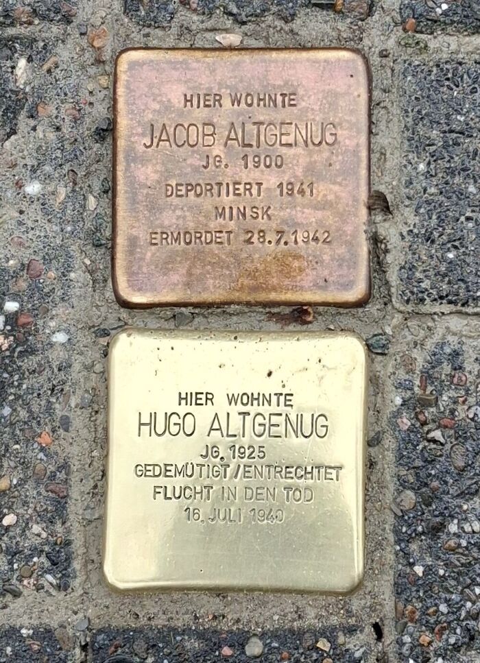 Hugo Hermann Joseph Altgenug, Sohn des Viehhändlers Joseph Hermann Altgenug 06.01.1889 und Sophie, geb. Weinberg 14.02 1896 wohnte mit seinen Eltern und zwei Brüdern, Fritz Joseph 08.09.1927 und Rolf Joseph 03.02.1930 in der Sielstr. 6.