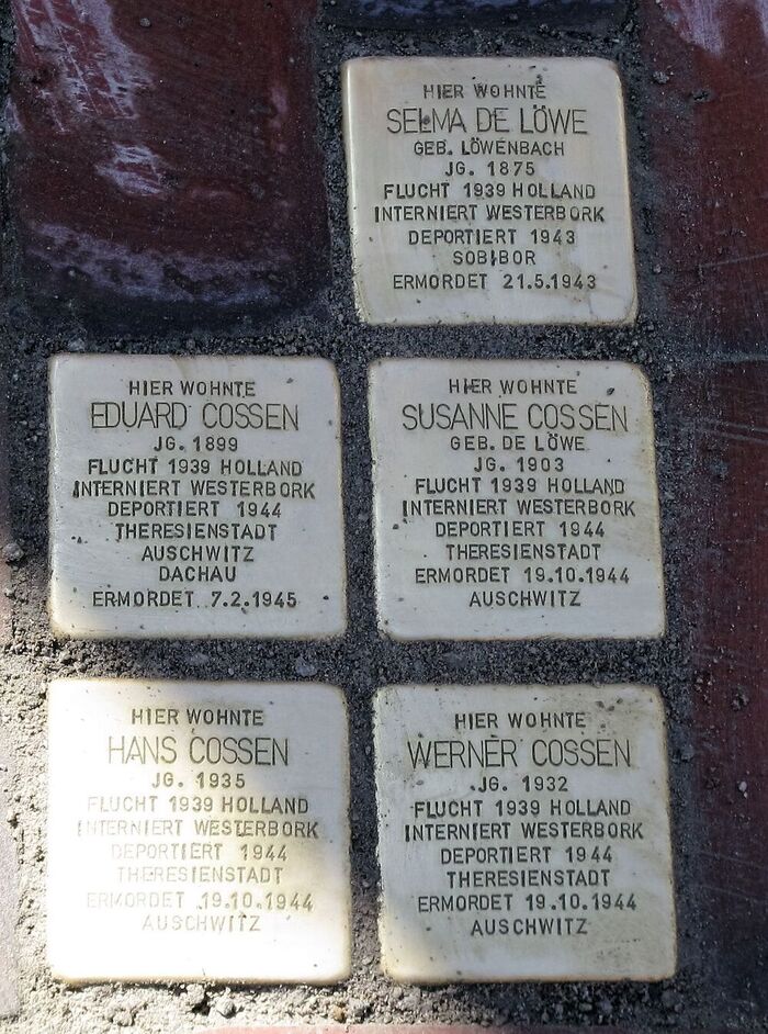 Selma de Löwe emigrierte zusammen mit ihrer Tochter Susanne 20.09.1903, deren Mann Eduard Cossen aus der Uffenstr. und ihren Söhnen Werner 02.03.1932 und Hans 24.09.1935 in die Niederlande. Sie wurden in Westerbork interniert, nach Theresienstadt deportiert, Susanne und die Kinder Oktober 1944 weiter nach Auschwitz und dort gleich nach der Ankunft ermordet. Eduard von Auschwitz weiter nach Dachau, wo er im Februar 1945 starb.