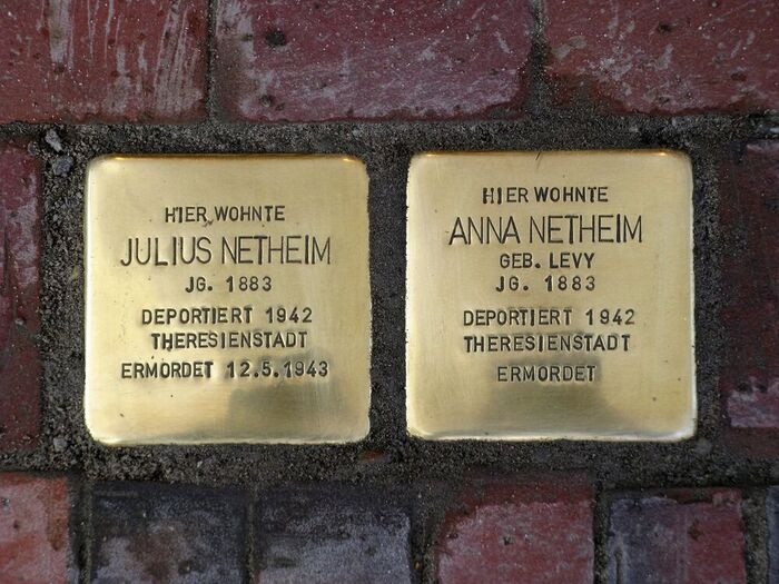 Julius Louis  Netheim20.05.1883  aus Ottenberg/Höxter, Sohn des Levi Netheim 1838-1923 aus Ottenheim  und  Lina, geb. Victor aus Duisburg, heiratete 1883 Anna Levy 20.04.1883, Tochter des Hauptlehrers des Predigers Abraham Levy aus Norden. Zuerst Angestellter des Getreidehändlers Samson, machte er sich 1826 als Großhändler für Getreide, Futter- und Düngemittel  in der Hindenburgstr. 102 (heute Neuer Weg) selbständig.  Sie hatten zwei Töchter,